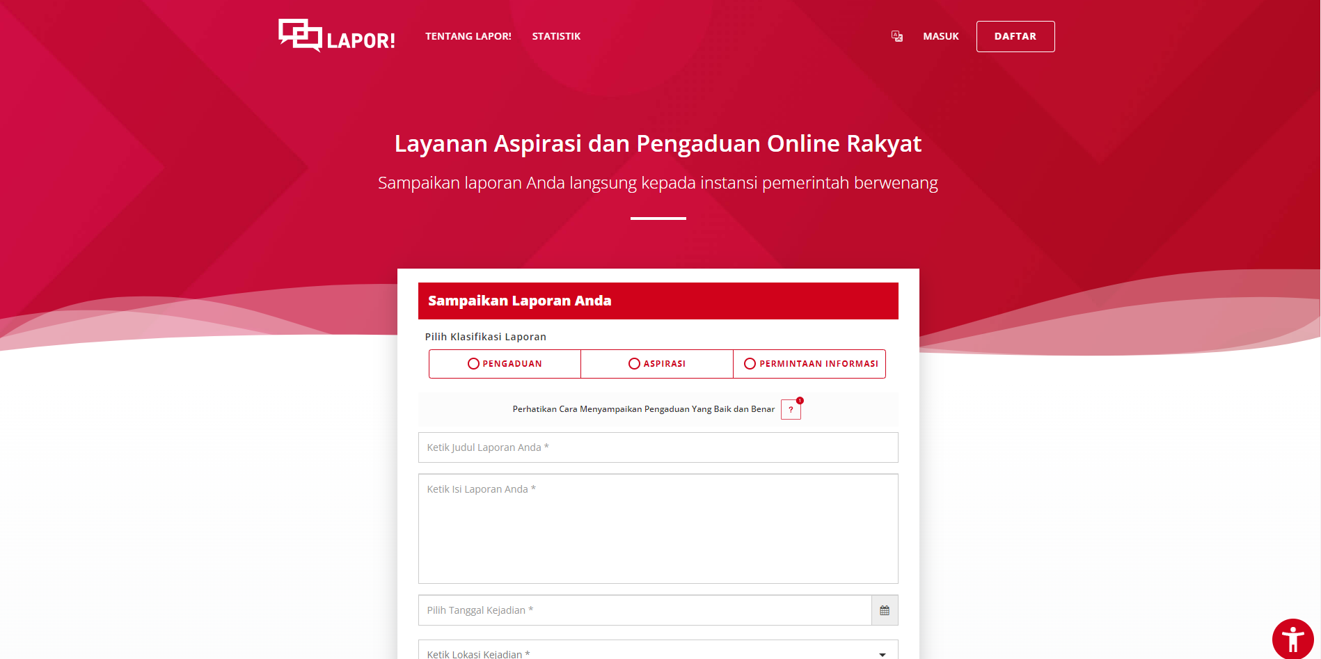 Untuk itu Pemerintah Republik Indonesia membentuk Sistem Pengelolaan Pengaduan Pelayanan Publik Nasional (SP4N) - Layanan Aspirasi dan Pengaduan Online Rakyat (LAPOR!) adalah layanan penyampaian semua aspirasi dan pengaduan masyarakat Indonesia melalui beberapa kanal pengaduan yaitu website www.lapor.go.id, SMS 1708 (Telkomsel, Indosat, Three), Twitter @lapor1708 serta aplikasi mobile (Android dan iOS). Lembaga pengelola SP4N-LAPOR! adalah Kementerian Pendayagunaan Aparatur Negara dan Reformasi Birokrasi (Kementerian PANRB) sebagai Pembina Pelayanan Publik, Kantor Staf Presiden (KSP) sebagai Pengawas Program Prioritas Nasional dan Ombudsman Republik Indonesia sebagai Pengawas Pelayanan Publik. LAPOR! telah ditetapkan sebagai Sistem Pengelolaan Pengaduan Pelayanan Publik Nasional (SP4N) berdasarkan Peraturan Presiden Nomor 76 Tahun 2013 dan Peraturan Menteri Pendayagunaan Aparatur Negara dan Reformasi Birokrasi Nomor 3 Tahun 2015.